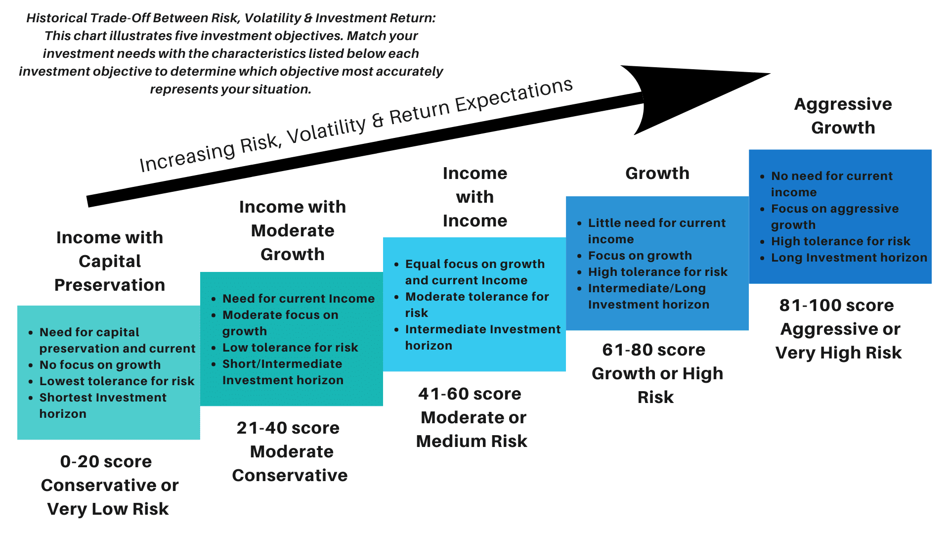 81-100 score – Aggressive or Very High Risk -Aggressive Growth. Emphasis is placed on aggressive growth and maximum capital appreciation. No focus on generation of current income. This objective has a very high level of risk and is for investors with a longer time horizon.